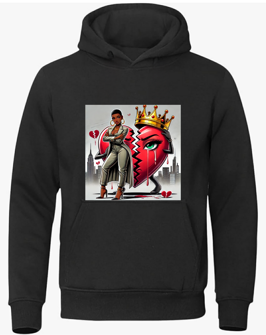 This black hoodie is a must-have for any stylish and edgy wardrobe. Made with high-quality material, it offers both durability and comfort. Perfect for any weather, this hoodie is a versatile piece that can be dressed up or down. Stand out and make a statement with the bold "Queen of broken hearts" design.