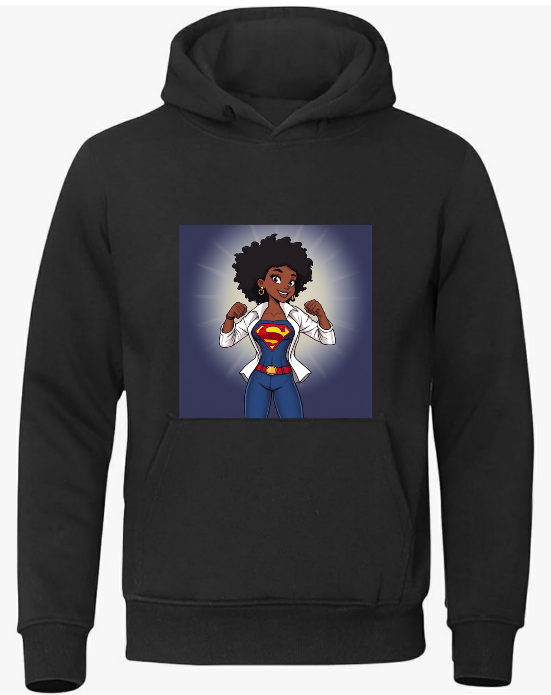 Stay warm and stylish in our black hoodie, "Superwoman 3". Made with high-quality material, this hoodie provides ultimate comfort and durability. Perfect for any occasion, it's a must-have addition to your wardrobe. Show off your inner superhero with this sleek and versatile black hoodie.