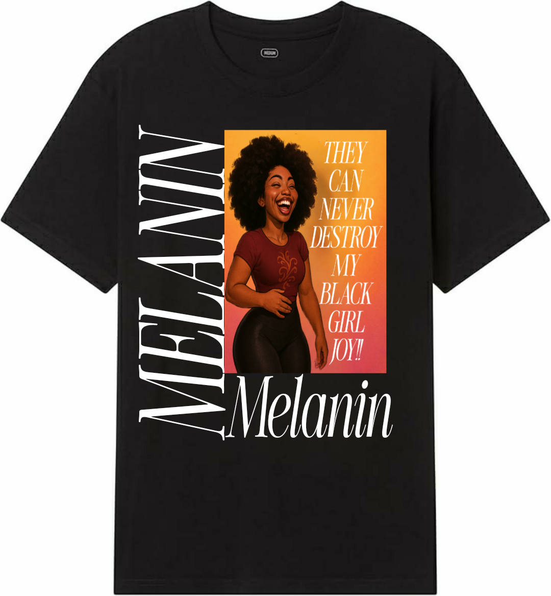 The Melanin Tee is a custom designed t-shirt that celebrates black girl joy and the power of melanin skin. Made with high-quality materials, this shirt showcases the beauty and strength of melanin skin in a simple yet powerful design. Embrace your natural beauty and make a statement with the Melanin Tee.