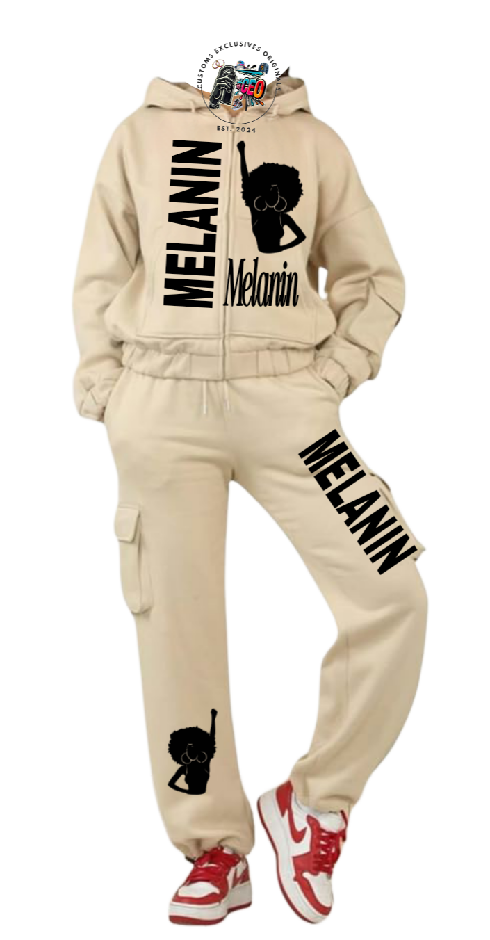 Celebrate the beauty and strength of melanin with this stylish custom-designed women's Melanin Black Power tracksuit. Crafted to honour cultural pride, it combines comfort and bold design, making it perfect for everyday wear or standout moments. The tracksuit’s unique pattern highlights strength and unity, offering a confident and empowering look that embraces identity with elegance and flair.