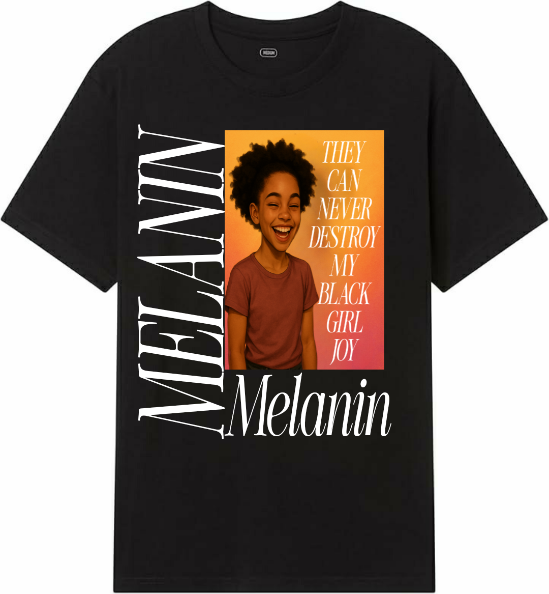 The Melanin Tee is a custom designed t-shirt that celebrates little black girl joy and the power of melanin skin. Made with high-quality materials, this shirt showcases the beauty and strength of melanin skin in a simple yet powerful design. Embrace your natural beauty and make a statement with the Melanin Tee.