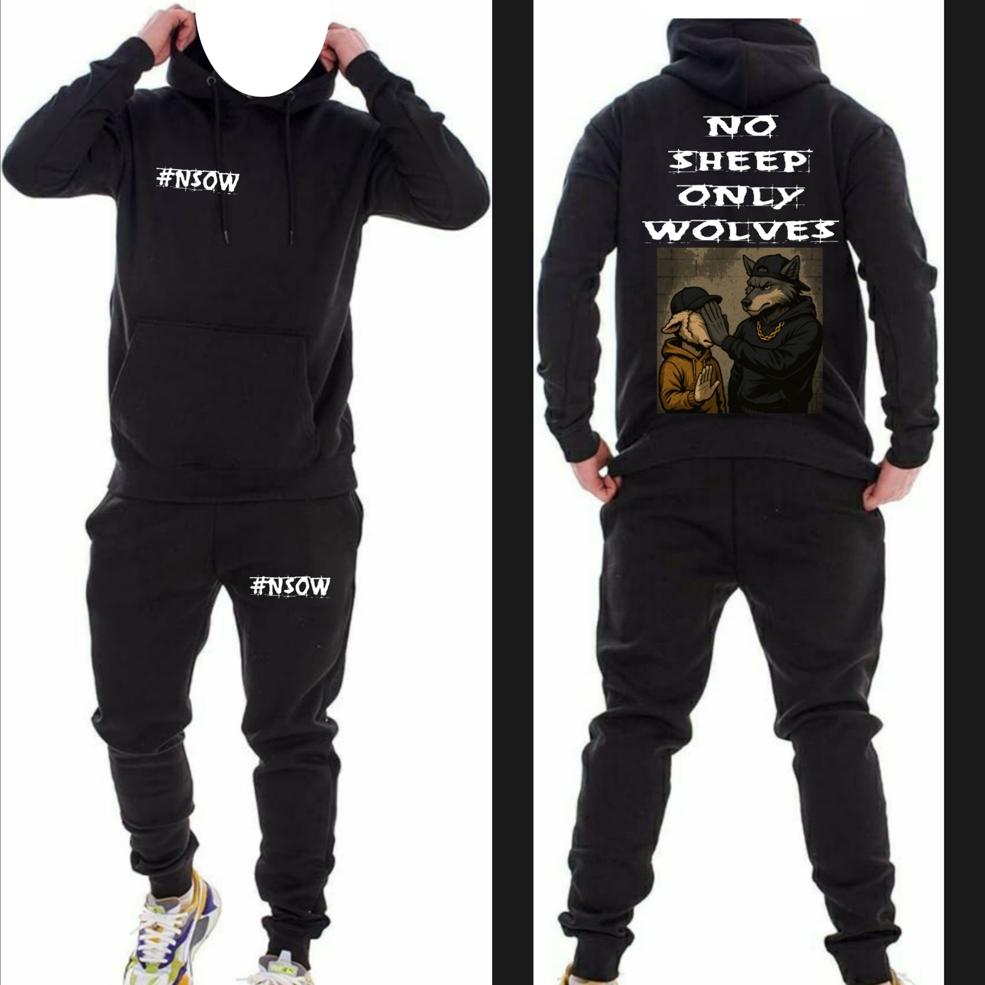Stay stylish with the #NSOW tracksuit. This custom designed jumper features the new brand #NSOW which stands for NO SHEEP ONLY WOLVES, representing a wolf mentality in fashion. Be bold and stand out from the crowd with this unique and empowering piece. Join the pack and unleash your true self.