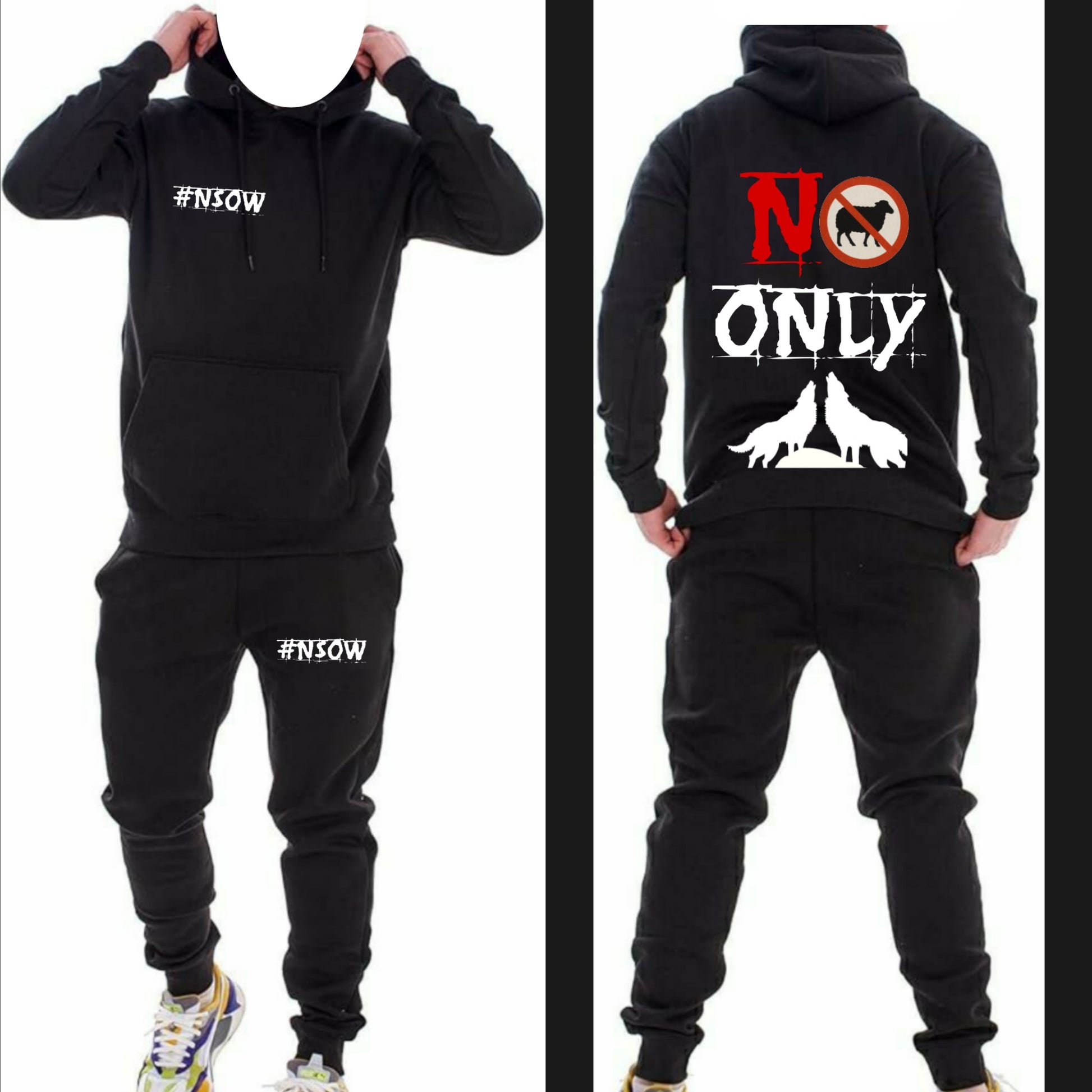Stay stylish with the #NSOW tracksuit. This custom designed jumper features the new brand #NSOW which stands for NO SHEEP ONLY WOLVES, representing a wolf mentality in fashion. Be bold and stand out from the crowd with this unique and empowering piece. Join the pack and unleash your true self.
