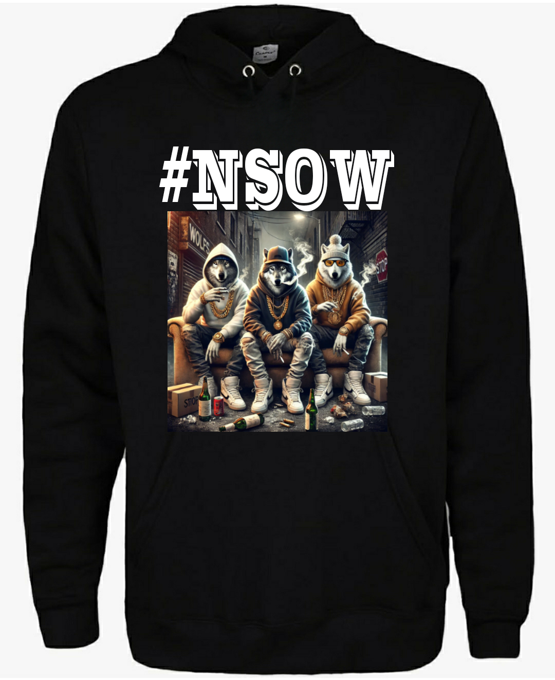 Stay stylish with the #NSOW Wolves chilling Hoodie Jumper. This custom designed jumper features the new brand #NSOW which stands for NO SHEEP ONLY WOLVES, representing a wolf mentality in fashion. Be bold and stand out from the crowd with this unique and empowering piece. Join the pack and unleash your true self.