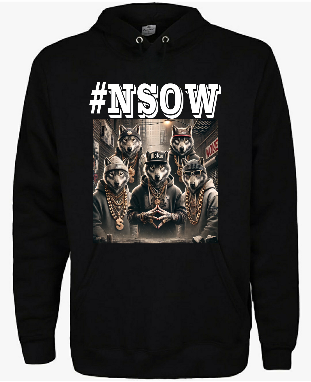 Stay stylish with the #NSOW Wolves chilling/hanging out Hoodie Jumper. This custom designed jumper features the new brand #NSOW which stands for NO SHEEP ONLY WOLVES, representing a wolf mentality in fashion. Be bold and stand out from the crowd with this unique and empowering piece. Join the pack and unleash your true self.