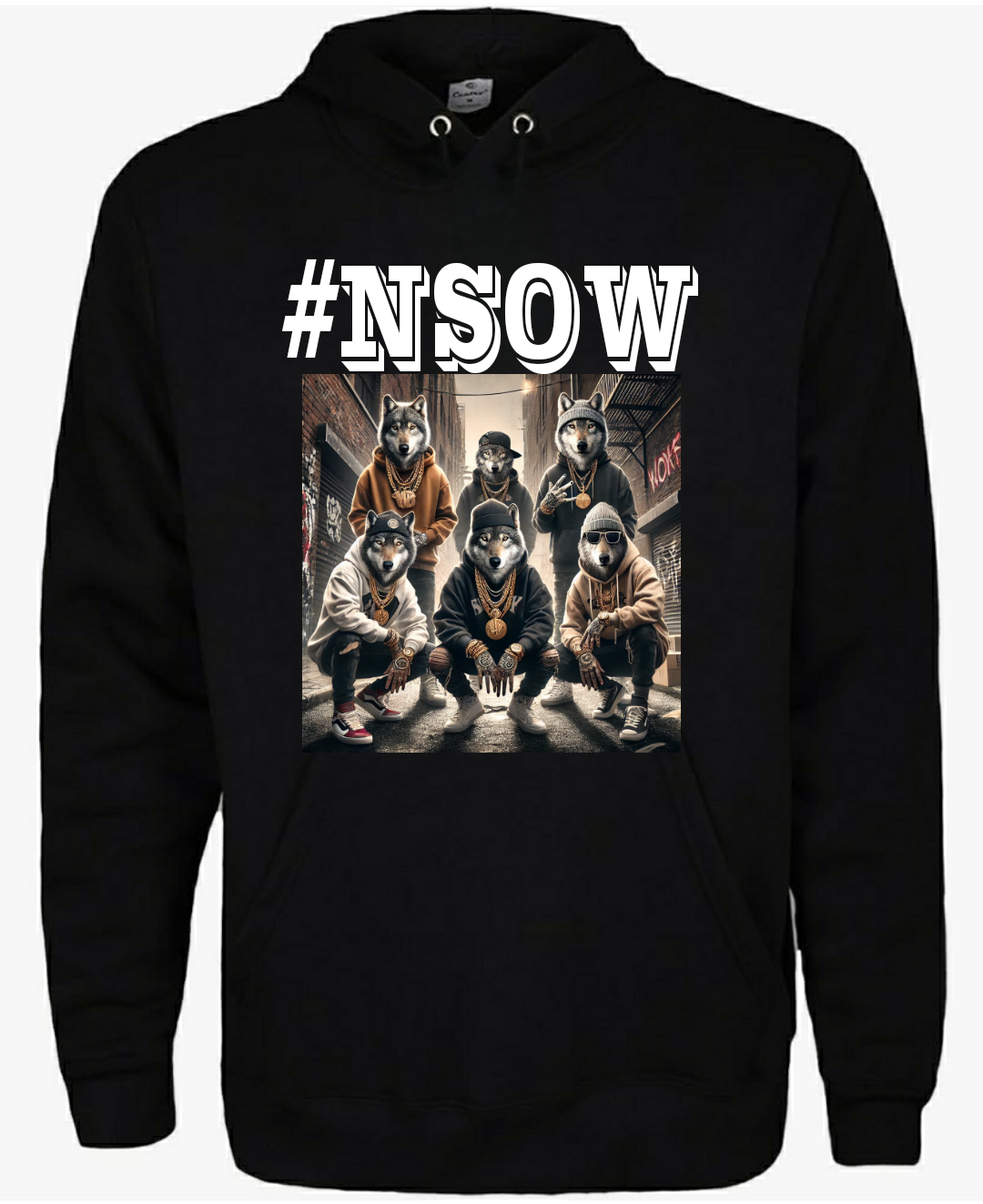 Stay stylish with the #NSOW Wolves chilling/hanging out Hoodie Jumper. This custom designed jumper features the new brand #NSOW which stands for NO SHEEP ONLY WOLVES, representing a wolf mentality in fashion. Be bold and stand out from the crowd with this unique and empowering piece. Join the pack and unleash your true self.