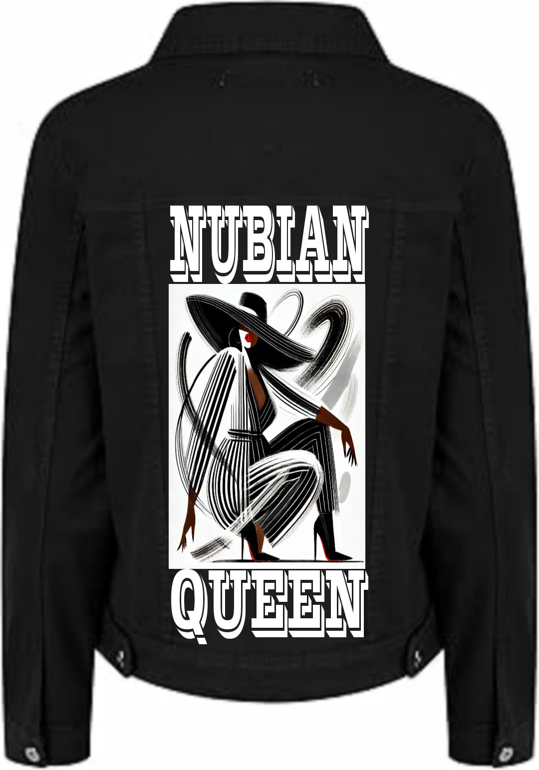 Expertly designed with a custom Nubian queen in abstract art, this denim jacket is a must-have for fashion enthusiasts. Made with high-quality denim, it offers both style and comfort. A perfect blend of culture and fashion, this jacket is truly unique and eye-catching.