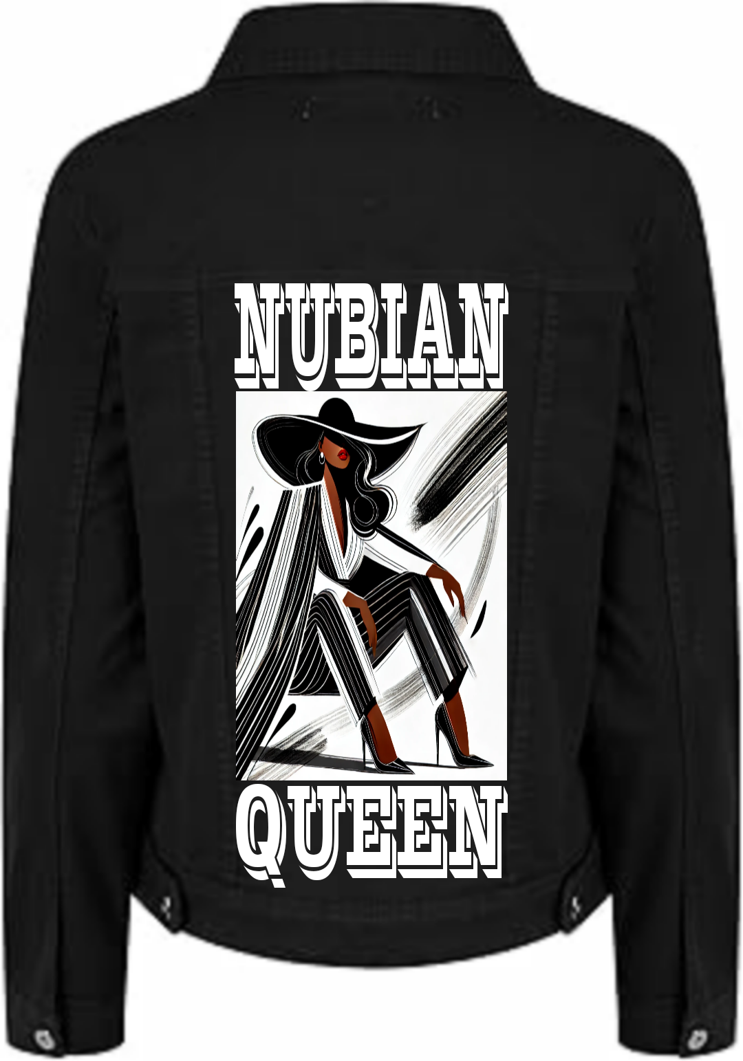 Expertly designed with a custom Nubian queen in abstract art, this denim jacket is a must-have for fashion enthusiasts. Made with high-quality denim, it offers both style and comfort. A perfect blend of culture and fashion, this jacket is truly unique and eye-catching.