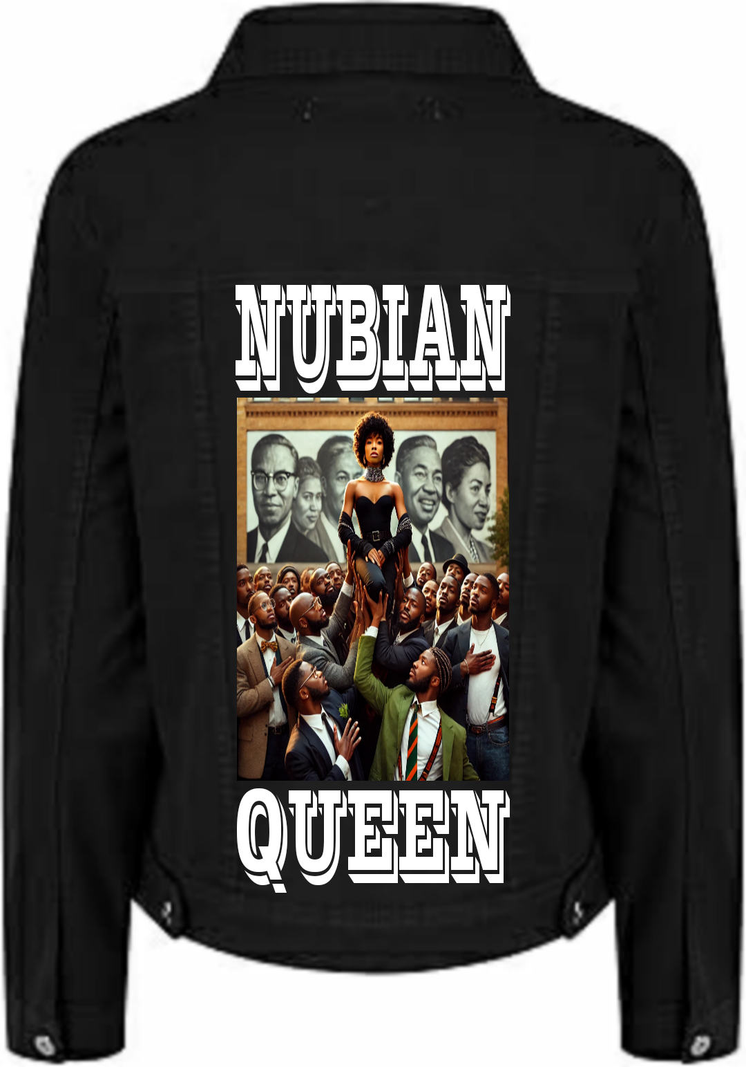 Expertly designed with a custom Nubian queen in abstract art, this denim jacket is a must-have for fashion enthusiasts. Made with high-quality denim, it offers both style and comfort. A perfect blend of culture and fashion, this jacket is truly unique and eye-catching.