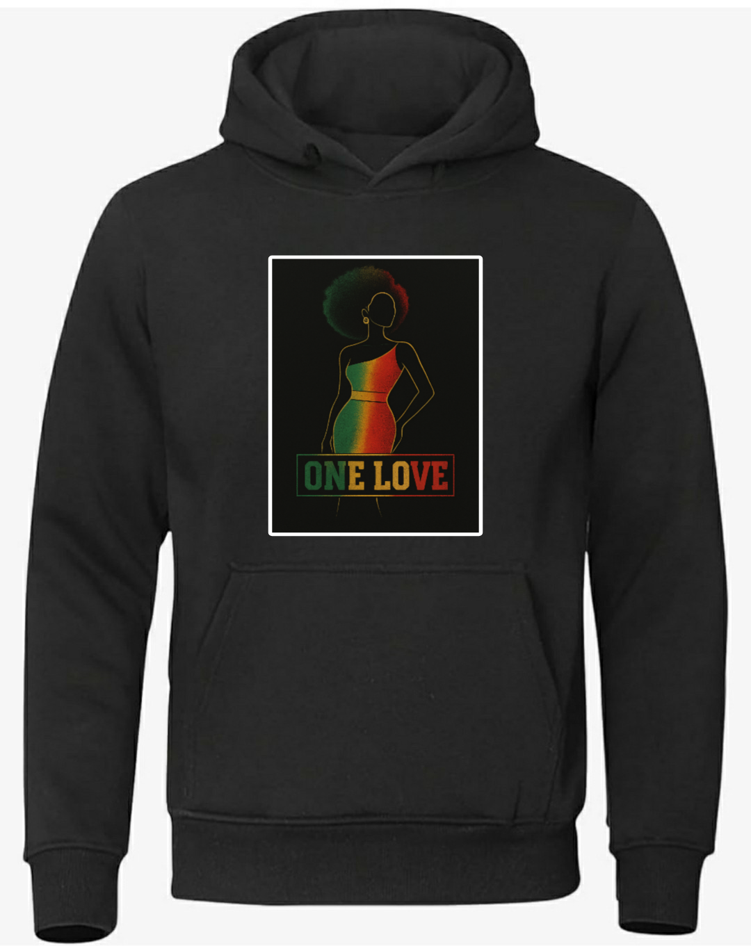Introducing our custom designed One Love hoodie jumper for women, inspired by the legendary musician Bob Marley. Made from high quality materials, this t-shirt is a perfect representation of both style and love. Spread positivity and show your appreciation for Bob Marley with this unique and fashionable tee.