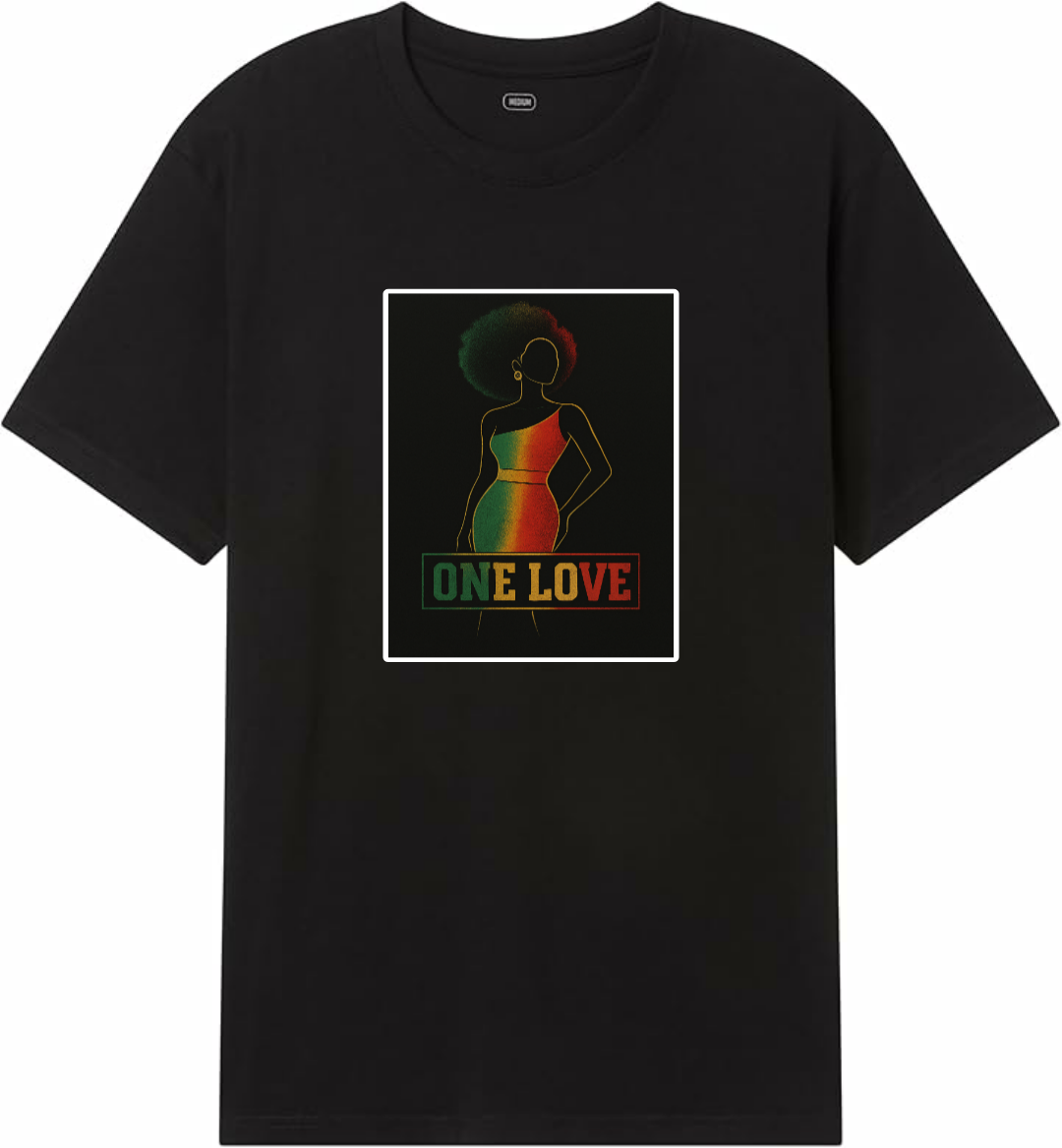 Introducing our custom designed One Love tee for women, inspired by the legendary musician Bob Marley. Made from high quality materials, this t-shirt is a perfect representation of both style and love. Spread positivity and show your appreciation for Bob Marley with this unique and fashionable tee.