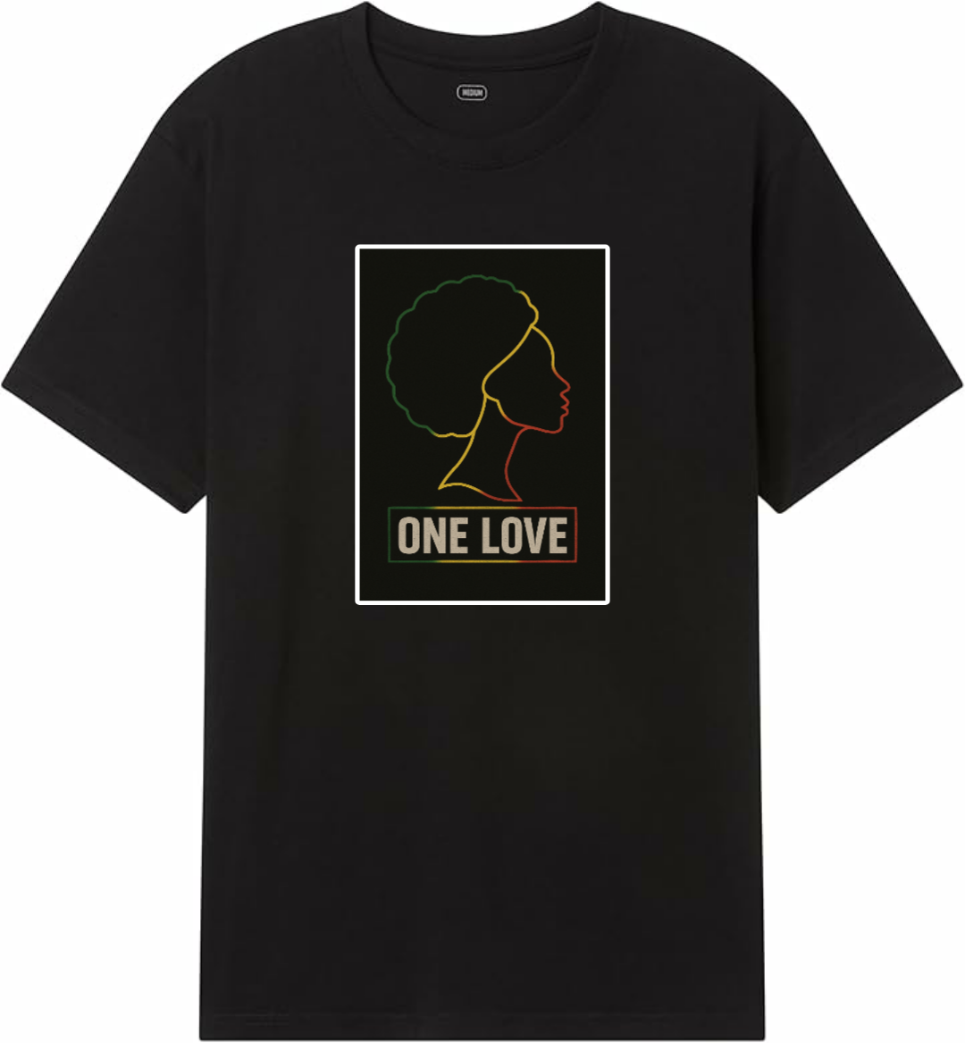 Introducing our custom designed One Love tee for women, inspired by the legendary musician Bob Marley. Made from high quality materials, this t-shirt is a perfect representation of both style and love. Spread positivity and show your appreciation for Bob Marley with this unique and fashionable tee.
