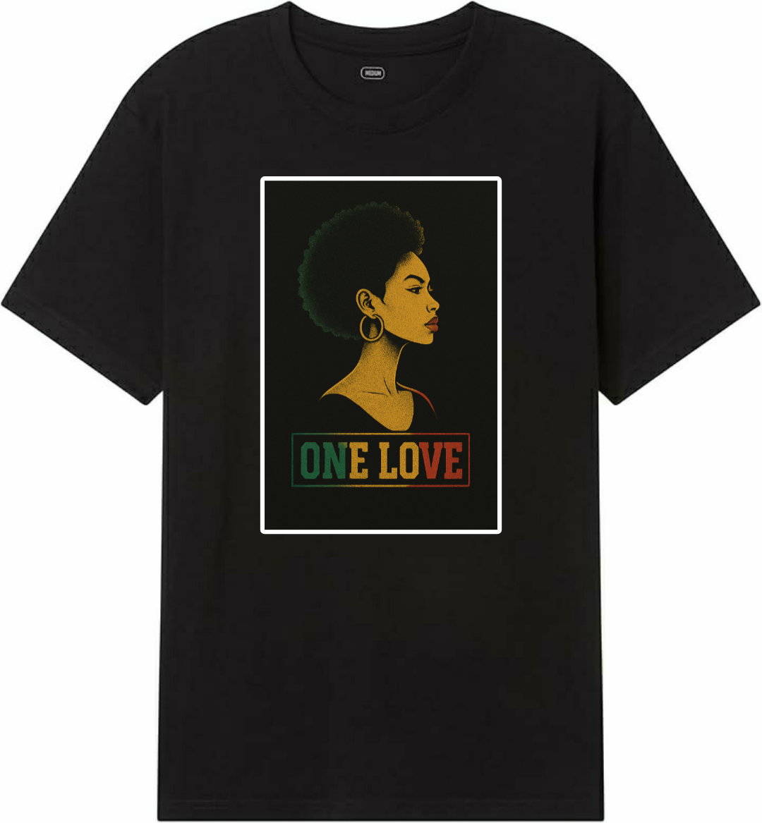 Introducing our custom designed One Love tee for women, inspired by the legendary musician Bob Marley. Made from high quality materials, this t-shirt is a perfect representation of both style and love. Spread positivity and show your appreciation for Bob Marley with this unique and fashionable tee.