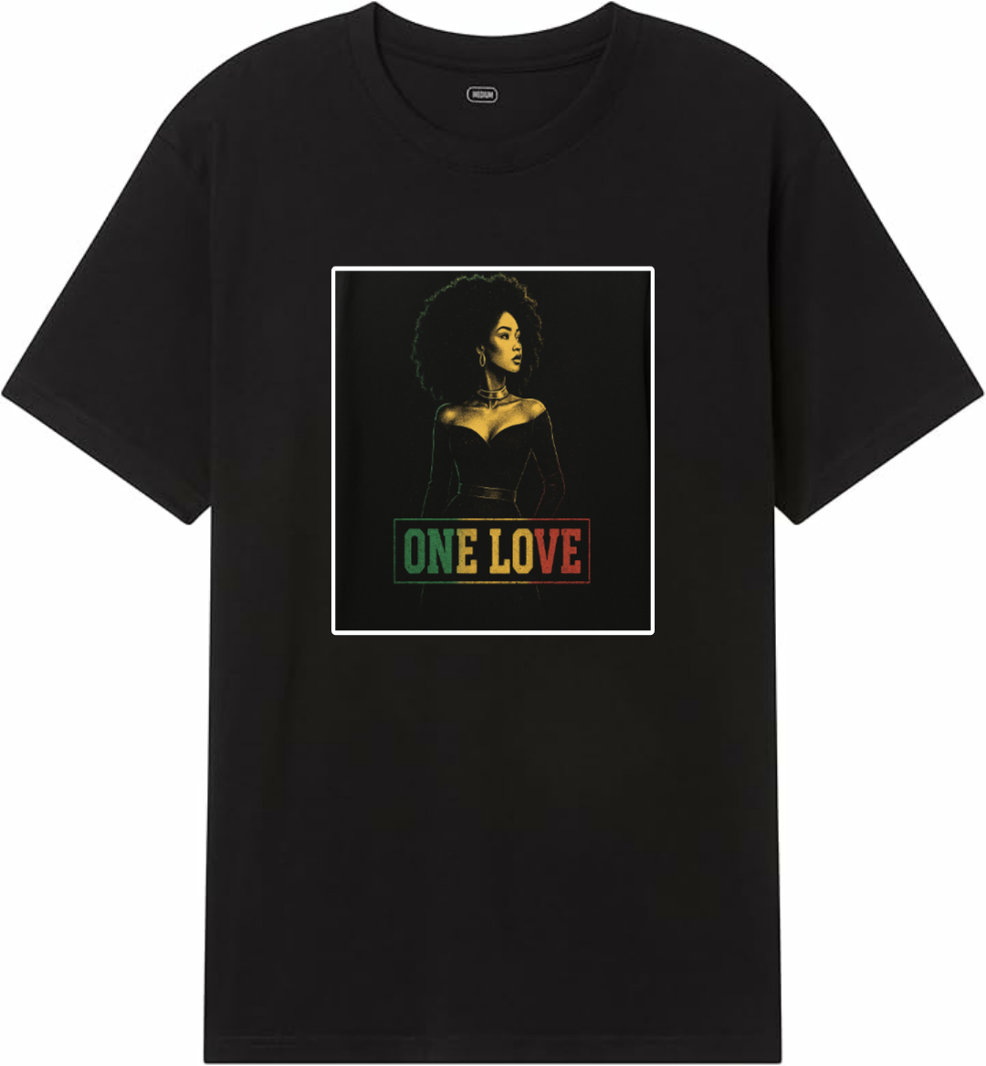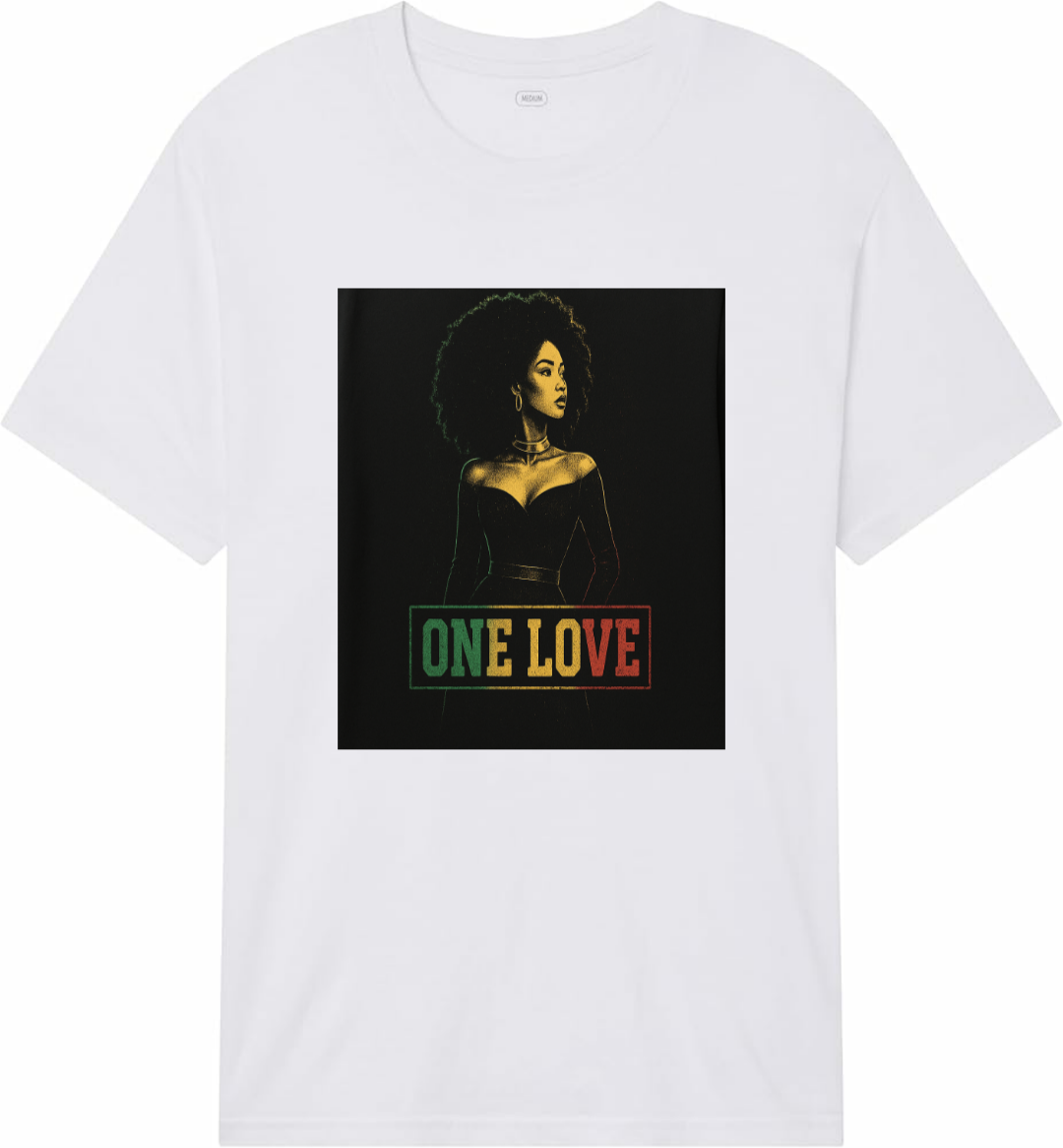 Introducing our custom designed One Love tee for women, inspired by the legendary musician Bob Marley. Made from high quality materials, this t-shirt is a perfect representation of both style and love. Spread positivity and show your appreciation for Bob Marley with this unique and fashionable tee.