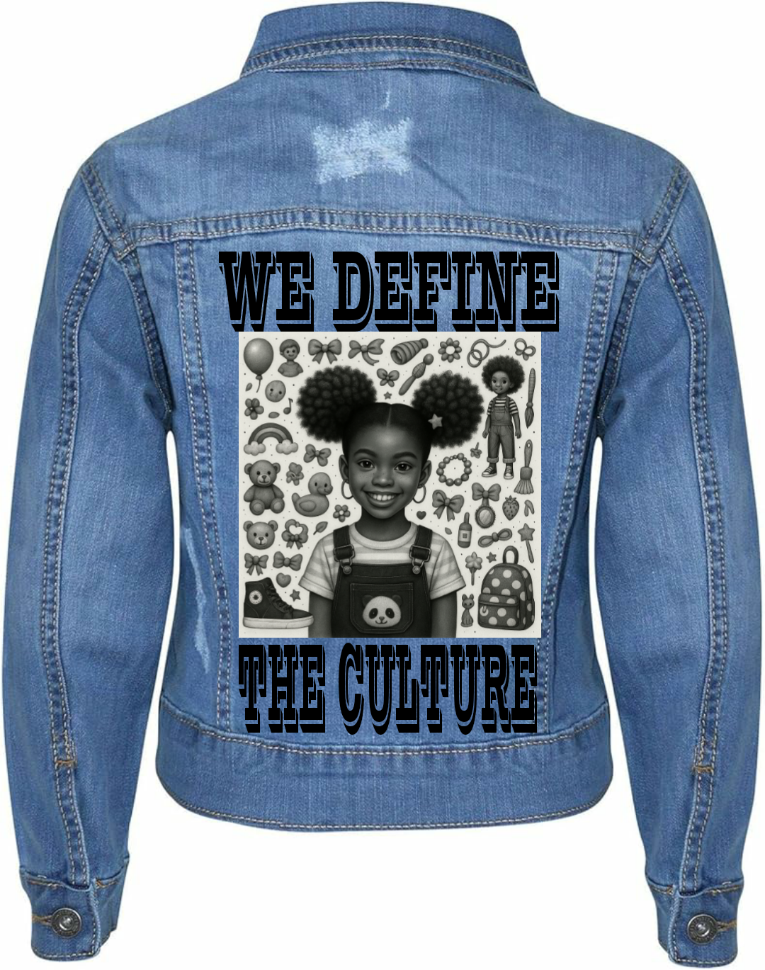 Expertly designed with a custom girl's We Define The Culture denim jacket is a must-have for fashion enthusiasts. Made with high-quality denim, it offers both style and comfort. A perfect blend of culture and fashion, this jacket is truly unique and eye-catching. Represent the beauty and importance of black culture while standing out in the crowd