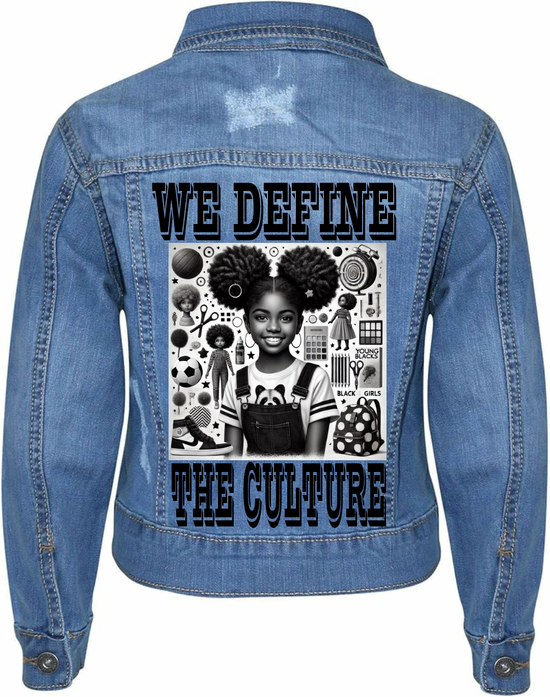 Expertly designed with a custom girl's We Define The Culture denim jacket is a must-have for fashion enthusiasts. Made with high-quality denim, it offers both style and comfort. A perfect blend of culture and fashion, this jacket is truly unique and eye-catching. Represent the beauty and importance of black culture while standing out in the crowd